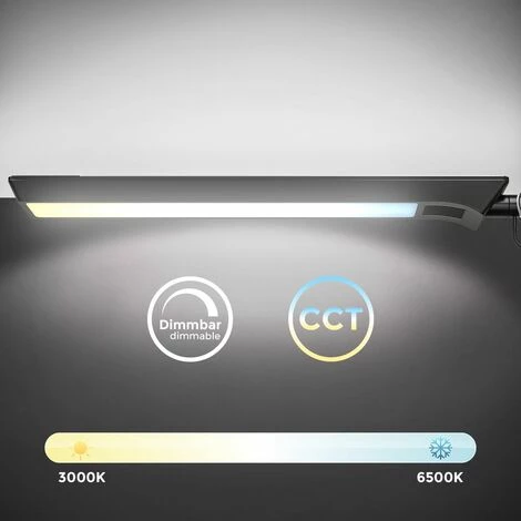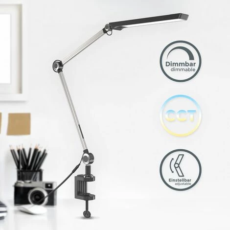 Résumé pour vous : Lampe de table LED Choix de la température de la lumière / CCT (3000K, 4000, 6500K) Graduation en continue largeur de serrage : 50mm Module LED intégré de 9W 880 Lumens d’Intensité lumineuse Fonction de mémoire Noir argenté 667x703mm (HxL), 703mm (projection) 1328mm (longueur complète, y compris la pince)