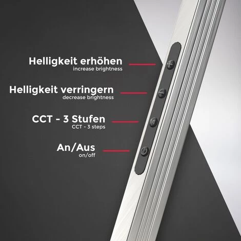 FONCTIONNEMENT : la couleur de la lumière (fonction CCT) et la variation d’intensité peuvent être facilement contrôlées à l’aide de boutons sur le luminaire. Vous pouvez choisir entre de la lumière blanche chaude, blanche neutre et blanche froide. L’intensité de l’éclairage est infiniment variable. Les derniers paramètres sont enregistrés automatiquement.