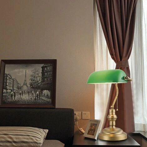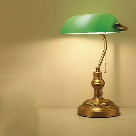 Lampe de bureau classique dite « de banquier » (ou « de notaire ») aux finitions effet laiton vieilli, dont l’abat-jour en verre laqué vert est orientable. Très décorative, elle éclaire salons, chambres, bureaux, etc. avec style en leur apportant une élégante touche rétro.