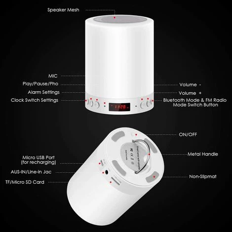 - Lampe de chevet + haut-parleur + réveil + horloge 4 en 1: C’est un appareil polyvalent qui combine une lampe de bureau + audio + réveil + réveil. Il vous procurera un confort sans fin pour votre vie.