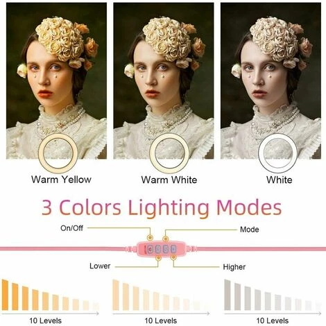 【 Luminosité réglable】 Lampe annulaire LED 6,3″ pour le maquillage dispose de 3 modes d’éclairage de couleur : lumière chaude, lumière blanche et lumière naturelle, 10 niveaux de luminosité réglables (3500K-6000K) pour répondre à tous vos besoins dans différentes occasions.C’est l’éclairage dimmable parfait pour supprimer toutes les ombres pour mettre en valeur votre beauté.