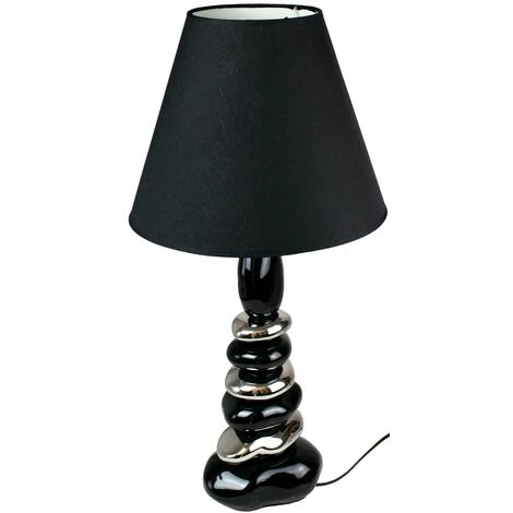 Grande lampe à poser en céramique pieds en galets noirs et argent, abat-jour en tissu