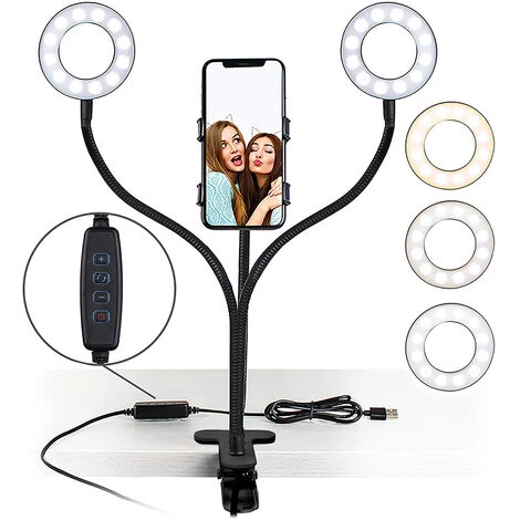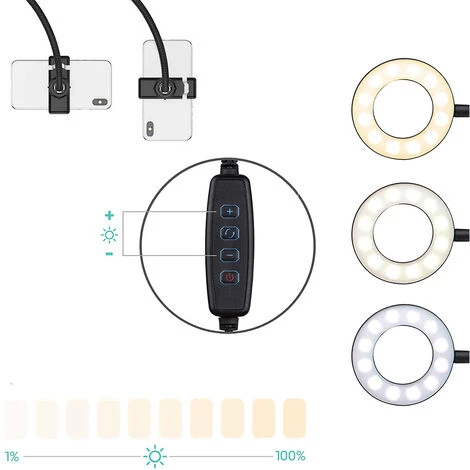 3. Conception du tuyau : le tube en métal souple peut être ajusté de manière flexible dans différentes directions pour obtenir l’angle souhaité ; le clip de base peut être installé de manière stable sur la table, mains libres et facile à utiliser. Combiné avec le support pour smartphone, l’anneau lumineux LED peut non seulement tourner dans n’importe quelle direction, mais peut également être plié et transporté, ce qui est efficace et peu encombrant.