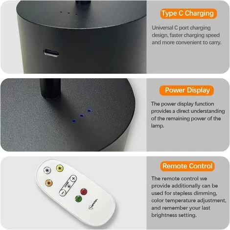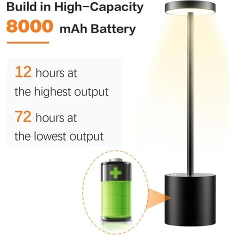 Batterie rechargeable intégrée de 8000 mAh alimentée par USB, la lampe de table peut fonctionner pendant 72 h au mode de puissance le plus bas et 12 h au mode de puissance le plus élevé.