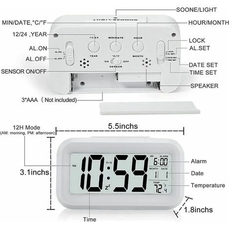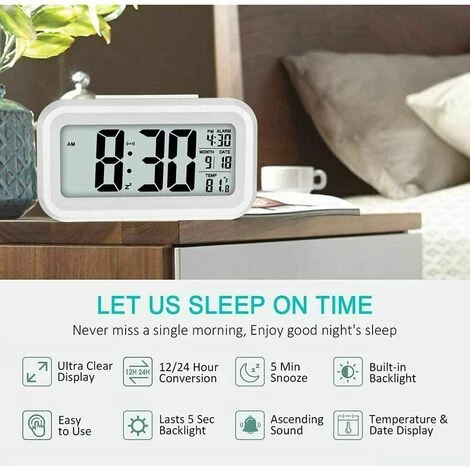 【Écran LCD plus grand】Le grand écran haute définition et les polices audacieuses offrent une vue plus large et plus claire. Réveil numérique avec heure, date et température, une excellente décoration pour votre bureau, votre chevet, votre chambre, votre maison et votre bureau, etc.【Fonction Snooze】 Lorsque la sonnerie retentit, appuyez une fois sur le bouton Snooze supérieur, le rétroéclairage s’allumera, la sonnerie s’arrêtera et elle continuera à sonner après 5 minutes. Vous pouvez assister à chaque occasion à l’heure.【Super facile à utiliser】 Boutons individuels pour régler l’heure, la date, l’alarme, l’unité de température et le mode week-end, etc., des opérations très simples pour les enfants, les étudiants et même les personnes âgées ; L’affichage de l’heure prend en charge le format 12 heures et 24 heures; Tous les réglages peuvent être terminés en quelques minutes.【Fonction d’éclairage intelligent】 L’horloge ne s’allume pas pendant la journée ou la pièce est suffisamment lumineuse. Lorsque la pièce est sombre, la lumière du capteur permet à l’horloge d’émettre automatiquement des lumières douces, ce qui est parfait la nuit ; La lumière du capteur peut également être proche, et veuillez simplement appuyer sur SNOOZE/LIGHT lorsque vous en avez besoin.【Cadeau parfait】 Réveil de haute qualité, facile à utiliser, particulièrement adapté pour être un cadeau pour votre famille ou vos amis.