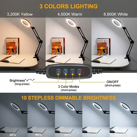 Loupe avec lumière et lampe loupe Ă LED avec 3 couleurs rĂ©glables (blanc, chaud, jaune) et 10 niveaux de luminositĂ©, qui amĂ©liorent efficacement la productivitĂ© et augmentent l’efficacitĂ© du travail. Parfait pour coudre, tricoter, Ă©tudier, Ă©crire, lire, travailler, etc. Lampe de bureau LED multifonction, choisissez .