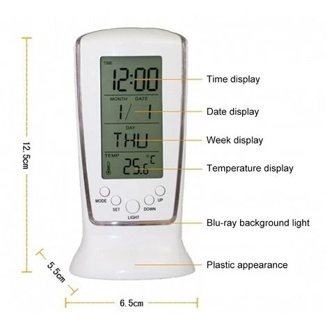 Spécifications:Rétro-éclairage LED bleu.Horloge LCD avec calendrier, thermomètre numérique.Alarme avec musique, fonction snooze.7 chansons d’alarme différentes et 2 sons didi différents.Chronographe compte à rebours.Rappel d’anniversaire dans la chanson d’anniversaire (la chanson d’anniversaire sera jouée automatiquement).Jeu de musique.Type: HorlogeCouleur principale: BlancRétro-éclairage De Couleur: BleuModèle horaire: 12 heures et 24 heuresMatériau: ABS, composant électroniqueAlimentation: 3 piles boutons AAA (non incluses)Fonctions: alarme, calendrier, thermomètre, rappel d’anniversaireOccasions: salon, bureau, salle de bain, cuisine, etc.Caractéristiques: rétroéclairage bleu, décoration de la maison, horloge numérique LEDDimensions: 125mm x 65mm x 55mm/4.92 « x 2.56 » x 2.17 « (environ)Notes:En raison de la différence de réglage de la lumière et de l’écran, la couleur de l’article peut être légèrement différente des images.Veuillez permettre une légère différence de dimension due à des mesures manuelles différentes.Le forfait Comprend:1 x horloge (les piles ne sont pas incluses.)1 x manuel d’utilisation en anglais