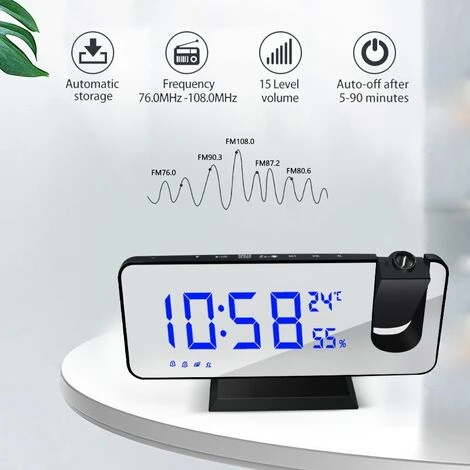 Caractéristiques:Grands chiffres led pour afficher l’heure, l’humidité et la température facile et pratique pour la lecture.Fonction de Projection: temps de projection, mise au point réglable, luminosité de projection à 3 niveaux, peut faire pivoter la Projection de 180 °.Réglage automatique de la lumière: dans ce mode, la luminosité de la projection ne peut pas s’ajuster automatiquement en fonction de la luminosité intérieure.Fonction radio FM: FM manuelle, le temps d’écoute peut être réglé, station de recherche automatique.Double fonction de réveil: 2 réveils peuvent être réglés à n’importe quelle date séparément, également en mode snooze.Fonction thermomètre intérieur: affichage de la température en temps réel, modes 12H/24H.4 niveaux de luminosité d’affichage peuvent être ajustés manuellement selon vos besoins.L’écran est spécialement avancé et peut être utilisé comme miroir de maquillage.Fonction de mémoire intégrée hors tension.Spécifications:Matériel: ABSEntrée USB: cc 5VCouleur de la lumière: bleu, blancFréquence FM: 87.5-108 MHzDistance de Projection: 0.5-5mRéglage du Volume: 0-15 niveauxFormat de l’heure: 12H/ 24HRéglage de la luminosité: 4 niveauxBatteries: 1 * CR2032 ou DC 5VListes de paquets:1 * horloge de Projection1 * CR20321 * câble USB1 * manuel de l’utilisateur