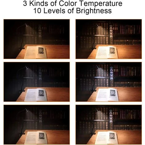 Description du produit:L’apparence de la lampe de bureau à pince Cestmall est très délicate et compacte, la fonction est très puissante, avec trois couleurs de lumière, la luminosité peut être réglée sur dix niveaux. Clip portable conçu pour répondre à une variété de besoins environnementaux et de luminosité.