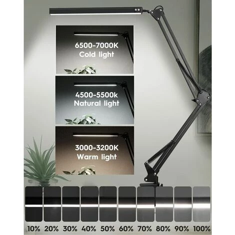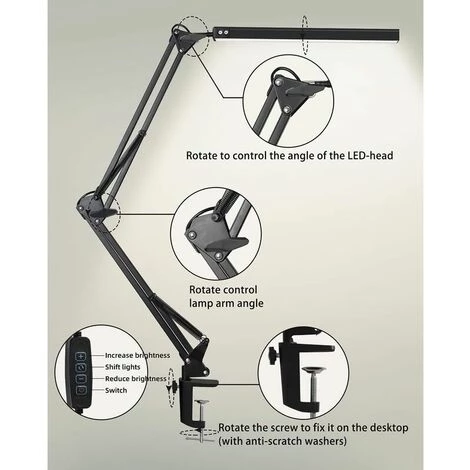 ăTechnologie de protection des yeux & 3 modes d’Ă©clairageăIl existe 3 modes d’Ă©clairage: la lumiĂšre chaude, la lumiĂšre naturelle et la lumiĂšre froide peuvent rĂ©pondre Ă vos diffĂ©rents besoins. La luminositĂ© est divisĂ©e en 10 niveaux, vous pouvez ajuster la luminositĂ© de la lampe de bureau en fonction des besoins, et la lampe ne clignotera pas, l’Ă©clairage doux sans Ă©blouissement peut Ă©viter la fatigue oculaire causĂ©e par le clignotement et la rĂ©flexion.ă Fonction mĂ©moire et rĂ©glage multi angles ălampe led bureau a une fonction mĂ©moire, qui reviendra automatiquement au rĂ©glage prĂ©cĂ©dent aprĂšs l’allumage. Nos lampes de bureau sont Ă©quipĂ©es de longs bras de lampe qui peuvent ĂȘtre pliĂ©s, la tĂȘte et le clip de la lampe peuvent ĂȘtre tournĂ©s Ă 360 degrĂ©s, les trois axes peuvent tourner de 270 degrĂ©s, fournir une plus grande zone d’Ă©clairage et un angle d’Ă©clairage plus flexible.ăĂconomies d’Ă©nergie & Ă©conomies d’espaceăLampes de bureau domestiques sont Ă©quipĂ©es d’ampoules Ă LED Ă©conomes en Ă©nergie qui fournissent une luminositĂ© de 10W tout en Ă©conomisant 80% d’Ă©nergie. La conception unique et les pinces de lampe de bureau peuvent les fixer sur le cĂŽtĂ© de la table. Les pinces robustes peuvent supporter jusqu’Ă 2 pouces de table et fixer fermement la lampe Ă bascule. Le design vertical n’occupe pas d’espace de bureau.ăRecharge usb pratiqueăLampe est alimentĂ©e par une prise USB,comme un ordinateur, une source d’Ă©nergie mobile, etc. Conseils chauds: ne peut ĂȘtre utilisĂ© qu’avec un adaptateur 5V / 2A (DC), sinon le contrĂŽleur de bouton – poussoir sera endommagĂ©, court – circuitĂ© et la durĂ©e de vie de l’ampoule led sera raccourcie.ăVous aurezăVous obtiendrez 1 lampe de table, 1 cĂąble USB, 1 manuel d’utilisation, 1 boĂźte cadeau exquise, plusieurs rondelles qui empĂȘchent le grattage et protĂšgent le bureau.Â