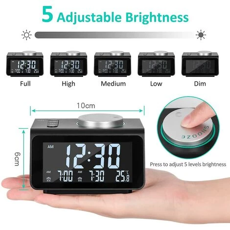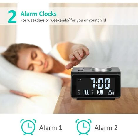 Réveil avec radio FM Le radio-réveil numérique FM peut choisir la gamme de fréquences de 87,5 à 108 MHz, vous pouvez également définir la FM comme sonnerie de réveil. La station de radio à balayage automatique peut enregistrer jusqu’à 60 canaux. Un haut-parleur fort et clair peut régler le volume pour vous aider à dormir en toute simplicité. C’est le plus beau cadeau pour vos amis, vos parents ou vos enfants. . Double alarme avec 7 sons Radio-réveil avec 6 sons naturels ascendants et 1 station de radio en option. Sélectionnez vos sons préférés pour chaque moment merveilleux. Le radio-réveil peut régler vos alarmes avec différentes durées temporaires ou à long terme. Le meilleur choix pour un gros dormeur ou comme montre de travail. . Luminosité réglable sur 5 niveaux Radio-réveil portable à écran LCD 3,2 », écran réglable sur 5 niveaux pour une luminosité confortable. Appuyez simplement sur le bouton rotatif et passez à la luminosité appropriée dont vous avez besoin. Facilitez-vous à voir clairement l’heure de jour comme de nuit, et la lumière n’interférera pas avec votre repos nocturne. . Deux ports de chargeur USB Les radio-réveils de chevet avec 2 ports USB peuvent recharger rapidement et en toute sécurité votre tablette, iPhone ou smartphone Android facilement. Ne résolvez pas les prises pour charger, assurez-vous que votre appareil est complètement chargé, ce qui empêche la batterie de se décharger pendant que vous dormez et vous permet d’être prêt lorsque vous vous réveillez. . Profitez de la vie avec ce réveil numérique Le radio-réveil est livré avec un câble USB pour alimenter le radio-réveil. Ce réveil numérique FM fonctionne via l’adaptateur (REMARQUE : non inclus). 3 piles AAA (non incluses) pour la sauvegarde nécessaire pour maintenir l’horloge en marche pendant une courte période en attendant une panne de courant. .