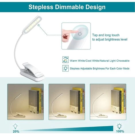 【Contrôle de la luminosité en continu】Différent du bouton de contrôle de la luminosité des autres lampes de lecture, ce clip de lampe de lecture sur le livre fournit un niveau de luminosité réglable en continu en appuyant longuement sur le bouton de commande, ce qui vous convient pour différents environnements de lecture. Le contrôle de la luminosité est super facile à utiliser et suffisamment sensible pour vous donner suffisamment de temps pour choisir votre niveau plutôt que d’autres qui changent trop rapidement.