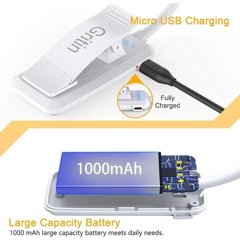 Batterie Rechargeable USB 1000mAh avec Indicateur: lampe de livre LED est dotée d’une batterie rechargeable haute performance intégrée de 1000 mAh, qui peut durer de 5-7 h à haute luminosité et 60 heures à faible luminosité. Vous pouvez utiliser le câble USB 1M inclus pour charger à tout moment. Il y a 4 voyants lumineux sur le terminal pour vous aider à déterminer l’état actuel de la batterie.