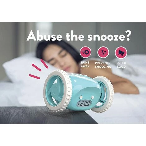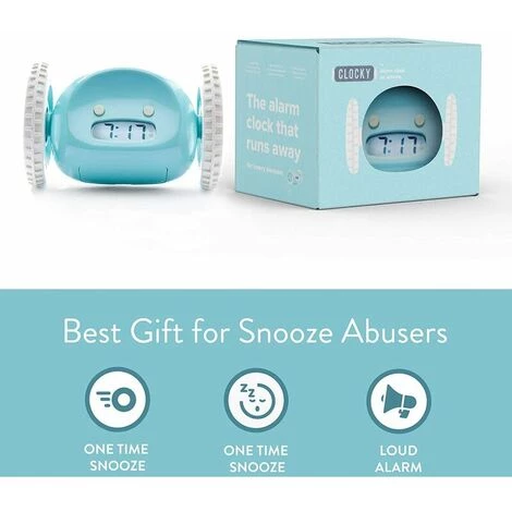 Réveil sur roulettes : le réveil de chevet saute, se cache, marche, secoue, change de direction pour vous réveiller et éteint son alarme. C’est amusant, ennuyeux, un peu fou et un gadget unique qui vous garantit de vous mettre sur la bonne voie. Déplacez-vous sur un tapis ou du bois.