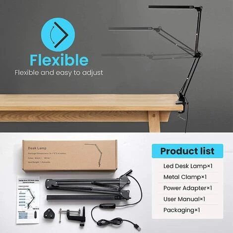 【Contenu de l’emballage】1X lampe de bureau, 1X 6,0 cm pince en métal, 1 X adaptateur 5 V/2 A, 1 X manuel de l’utilisateur .